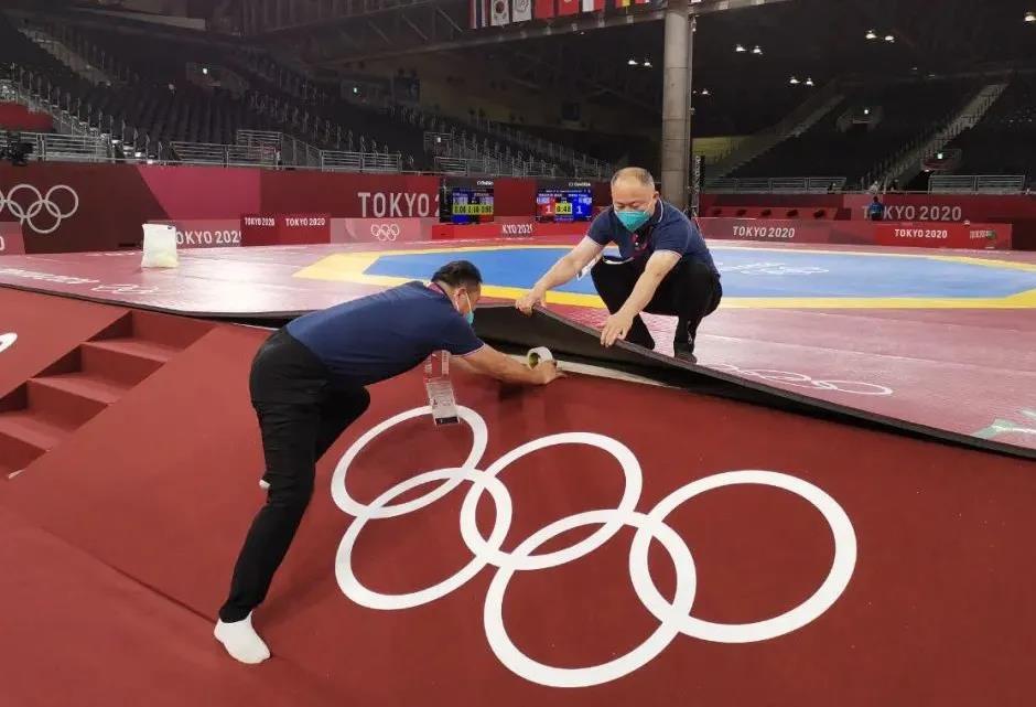 2021年7月20日,日本武道馆——奥运会柔道比赛场地。365WM完美体育东京奥运会服务保障团队正在布置、安装柔道器材。