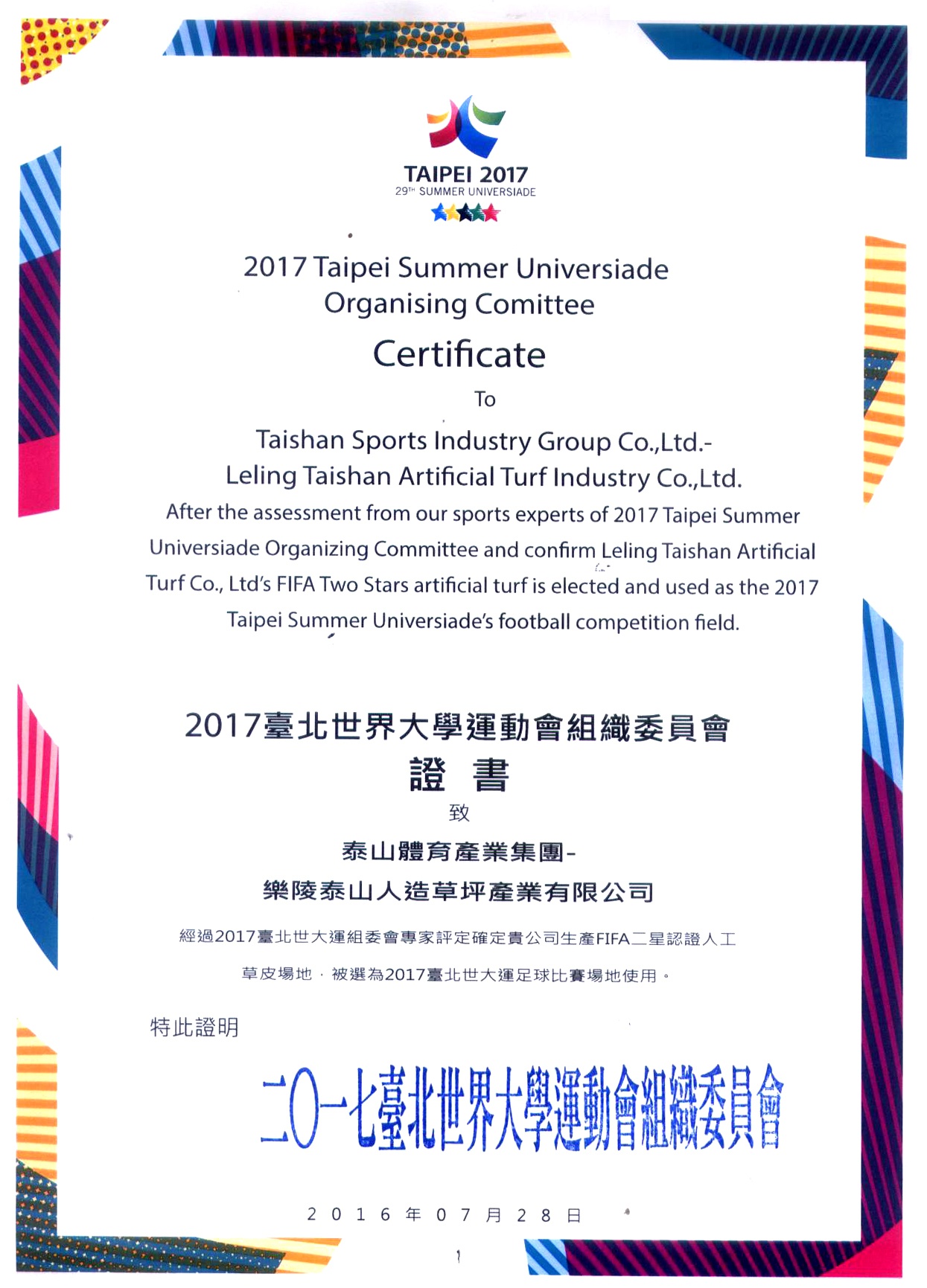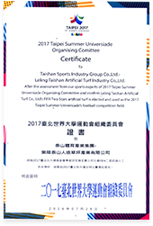 2017台北世界大学运动会组织委员会证书致乐陵365WM完美人造草坪产业有限公司